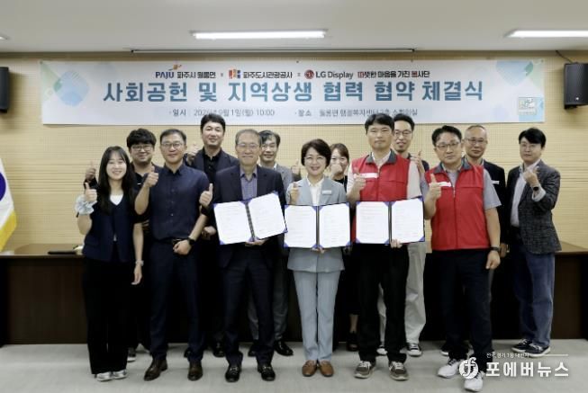 [ 포에버뉴스 김경순 기자 ] 파주도시관광공사는 지난 9월 1일 파주시 월롱면 행정복지센터 2층 소회의실에서 월롱면과 LG디스플레이 직원들로 구성된 봉사단 따봉(따뜻한 마음을 가진 봉사단)과 지역 상생협력 협약(MOU)을 체결했다.