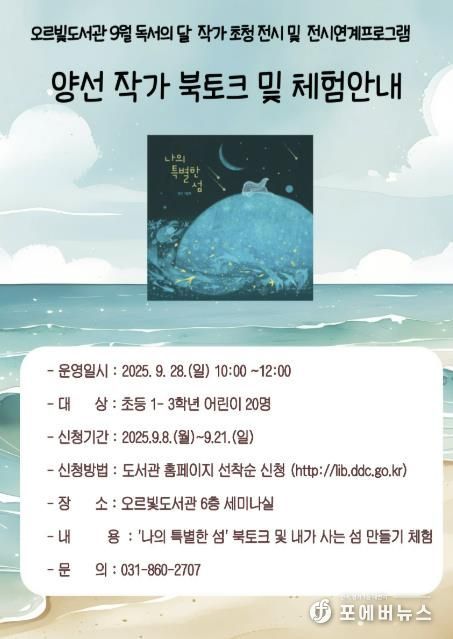 북토크와 체험 프로그램은 9월 28일 6층 세미나실에서 열린다. 초등 1~3학년을 대상으로 그림책 함께 읽기, 작가와의 질의응답, ‘내가 사는 섬 만들기’ 체험 활동이 진행돼 어린이들이 직접 창의력을 발휘할 수 있는 기회를 제공한다.
