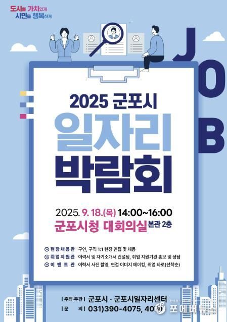 [ 포에버뉴스 김경순 기자 ] 군포시는 오는 9월 18일 오후 2시, 군포시청 대회의실에서 ‘2025년 하반기 군포시 일자리 박람회’를 개최한다. 이번 박람회는 지역 내 우수 기업과 구직자가 직접 만나는 채용의 장으로 일자리 기회를 제공할 예정이다.