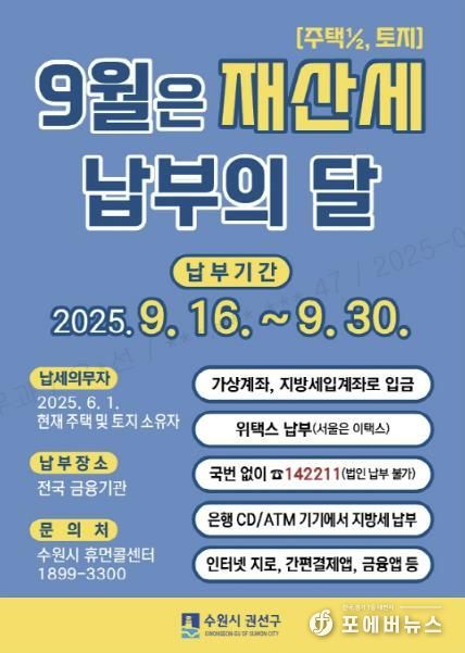 [ 포에버뉴스 김경순 기자 ] 수원시 권선구는 2025년 9월 정기분 재산세 551억원을 부과한다. 이는 전년 대비 21억원(3.9%)가 증가한 것으로, 주택가격 및 공시지가의 상승이 세액 증가의 주요 원인으로 분석된다.
