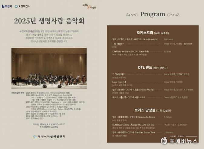 한편 부천시는 이번 음악회에 이어 9월 13일 부천중앙공원에서 ‘생명사랑 희망나눔 캠페인’을 열 예정이다. 이와 함께 부천시자살예방센터는 앞으로도 생명존중 문화 확산을 위한 시민 인식개선 활동을 지속적으로 추진해 나갈 계획이다.