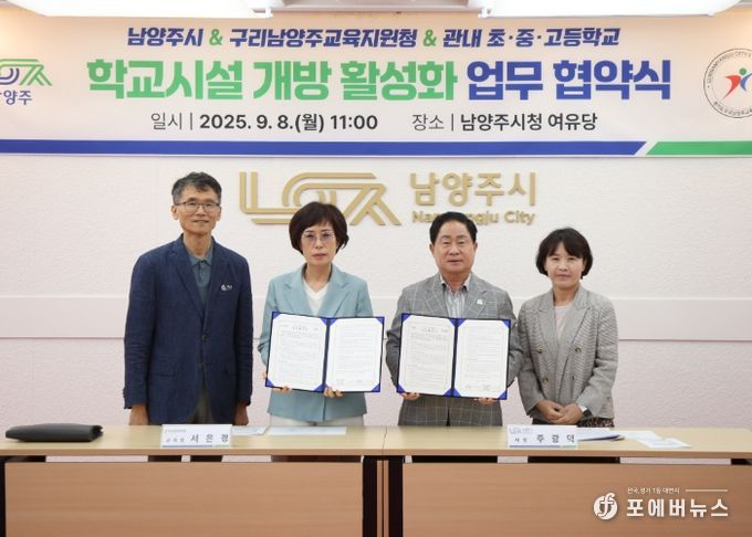 [ 포에버뉴스 김경순 기자 ] 남양주시는 8일 시청 여유당에서 경기도구리남양주교육지원청 및 관내 초·중·고등학교와 함께 ‘학교시설 개방 활성화를 위한 업무협약’을 체결했다.