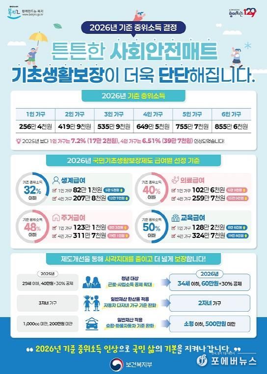 기준 중위소득은 국민 가구소득의 중간값으로 생계·의료·주거급여 등 80여 개 복지사업의 선정 기준으로 활용되며 이번 인상은 4인 가구 기준 역대 최대 폭으로, 내년에는 4인 가구 기준 생계급여가 최대 12만 7,029원이 추가로 지급돼 207만 4,238원의 급여를 받을 수 있게 된다.