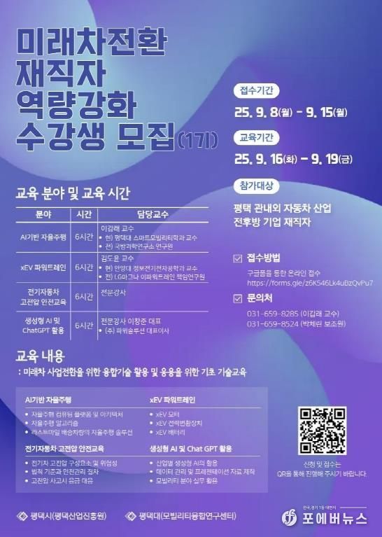 [ 포에버뉴스 김경순 기자 ] 평택시와 평택산업진흥원은 평택대학교, KG모빌리티, 지역 내 부품사 등과 협력해 ‘미래자동차 전환 재직자 역량 강화교육’을 2025년 9월부터 추진하며, 9월 15일까지 교육생을 모집한다. 교육 인원은 총 30명으로 한정하며, 교육 과정당 10~15명 내외 소규모로 분반하여 진행한다.