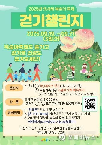 [ 포에버뉴스 박정배 기자 ] 이천시 남부건강생활지원센터는 ‘2025년 햇사레 장호원 복숭아 축제’가 열리는 9월 19일부터 9월 21일까지 3일간 ‘햇사레 복숭아 축제 걷기 챌린지’를 진행한다고 밝혔다.