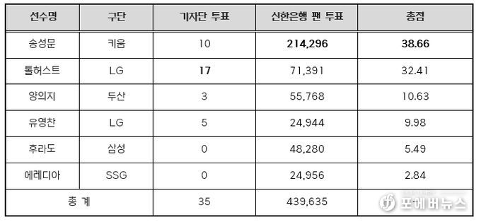 송성문은 기자단 투표 총 35표 중 10표(28.6%), 팬 투표 43만 9,635표 중 21만 4,296 표(48.7%)로 총점 38.66점을 받아, 기자단 투표 17표, 팬 투표 7만 1,391표로 총점 32.41점을 기록한 LG 톨허스트를 제쳤다.