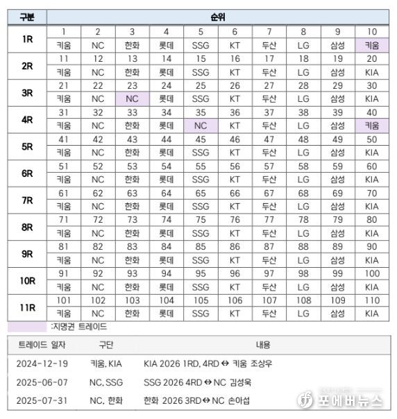 KBO 규약에 따라 2026 신인 지명권이 선수와 트레이드 된 사례는 3차례, 총 4개의 지명권 이동이 있었다. NC는 한화와 SSG로부터 각각 양수 받은 3, 4라운드 지명권을, 키움은 KIA로부터 양수 받은 1, 4라운드 지명권을 갖는다. 따라서 전 구단이 모든 지명권을 행사할 경우, 키움과 NC는 13명, 한화와 SSG는 10명, KIA는 9명, 이외 구단들은 11명의 선수를 지명하게 돼, 총 110명의 선수가 KBO 리그 구단 유니폼을 입게 된다.