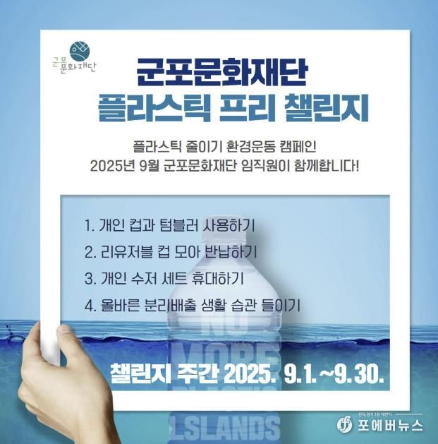[ 포에버뉴스 김경순 기자 ] 군포문화재단은 임직원들과 함께 '플라스틱 프리 챌린지' 캠페인을 9월 한 달 동안 진행한다고 밝혔다. 이번 캠페인은 플라스틱 사용을 줄이고, 친환경 의식을 높이기 위해 기획된 임직원 참여형 ESG 활동이다.