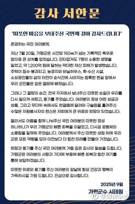 서 군수는 서한문에서 “절망 속에서 전국 각지에서 보내주신 따뜻한 손길이 우리를 다시 일으켜 세웠다”며 “성금과 성품, 그리고 무더위에도 구슬땀을 흘린 자원봉사자들의 헌신이 큰 위로와 희망이 됐다”고 강조했다. 또한 “멀리서도 아픔을 함께 나눠준 국민 여러분의 정성 하나하나가 가평군의 빠른 회복을 이끌었다”며 “이웃과 공동체의 소중함을 다시금 일깨워 주었다”고 덧붙였다.