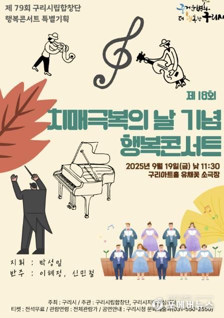 행사에는 구리시립합창단이 참여해 수준 높은 공연을 선보이며, 시민들에게 감동과 여운을 전할 예정이다. 특히 음악을 매개로 치매에 관한 관심과 공감을 자연스럽게 끌어낼 수 있을 것으로 기대된다.