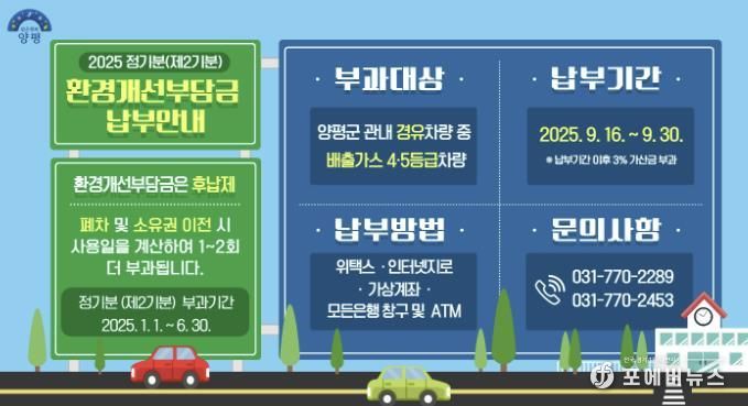 [ 포에버뉴스 박정배 기자 ] 양평군은 2012년 9월 이전에 출고된 노후 경유 자동차(배출가스 4·5등급) 3,825대에 대해 제2기분 환경개선부담금 1억 2,740만 원을 부과한다고 밝혔다.
