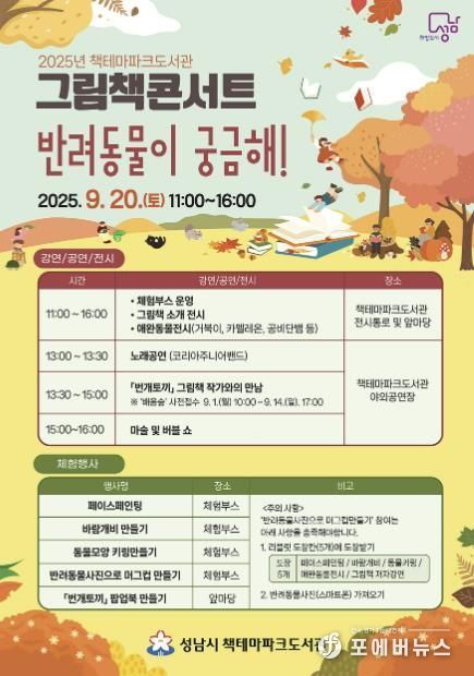 [ 포에버뉴스 김경순 기자 ] 성남시는 오는 9월 20일 오전 11시~오후 4시 분당구 율동공원 내 책테마파크도서관에서 ‘반려동물이 궁금해!’ 주제로 한 그림책 콘서트를 연다.