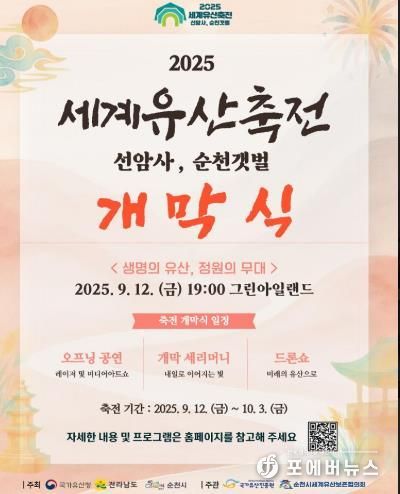 [ 포에버뉴스 오명숙 기자 ] 순천시와 순천시 세계유산보존협의회는 오는 12일 19시 그린아일랜드에서 '2025 세계유산축전 선암사, 순천갯벌' 개막식을 개최한다고 밝혔다.