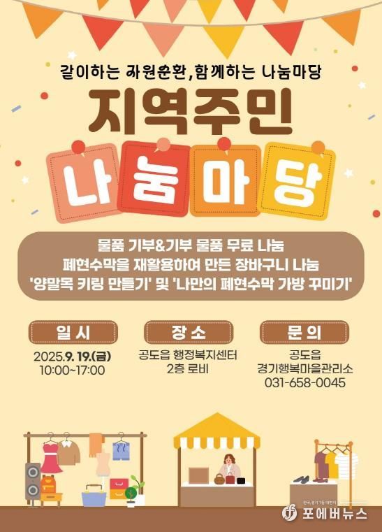 [ 포에버뉴스 김경순 기자 ] 공도읍 경기행복마을관리소는 오는 9월 19일 오전 10시부터 오후 5시까지 공도읍 행정복지센터 2층 로비에서 ‘지역주민 나눔마당’을 개최한다.