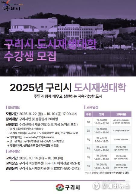 [ 포에버뉴스 김경순 기자 ] 구리시는 9월 22일부터 10월 10일까지 '2025년 구리시 도시재생 대학' 수강생을 모집한다고 밝혔다.