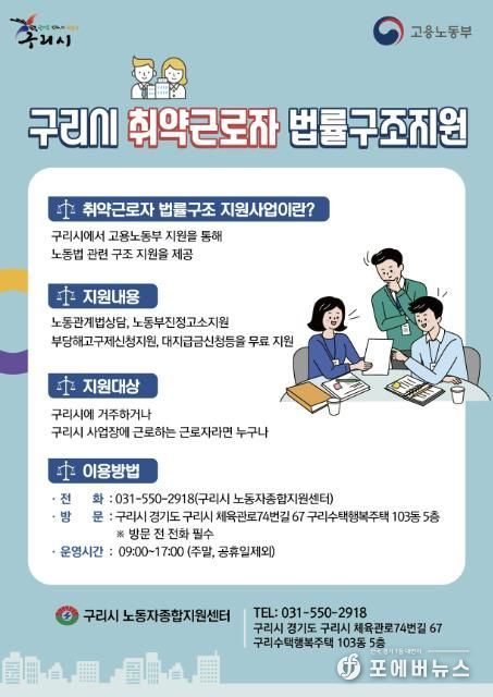 [ 포에버뉴스 김경순 기자 ] 구리시는 최근 경기 불황으로 임금체불 문제가 사회적 이슈로 드러남에 따라 '2025년 노동 약자 일터 개선 사업'의 일환으로 노동 약자 법률구조 사업을 오는 9월 22일부터 확대 시행한다고 밝혔다.