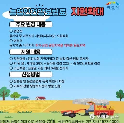 [ 포에버뉴스 박정배 기자 ] 이천시가 국민건강보험공단과 협력하여, 그간 건강보험료 지원 대상에서 일부 제외됐던 동지역 거주 농업인에 대한 지원을 확대하기로 했다. 이번 조치는 농업인 복지 향상과 제도 형평성 확보를 위한 행정 협력의 모범 사례로 평가받고 있다.