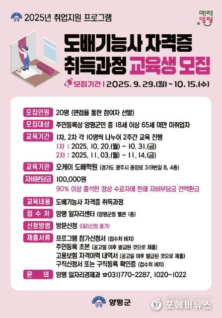 [ 포에버뉴스 박정배 기자 ] 양평군은 오는 29일부터 인테리어 전문 기술 인재 양성과 지역 일자리 창출을 위해 2025년 취업지원 프로그램 ‘도배기능사 자격증 취득과정’ 교육생을 모집한다고 밝혔다.