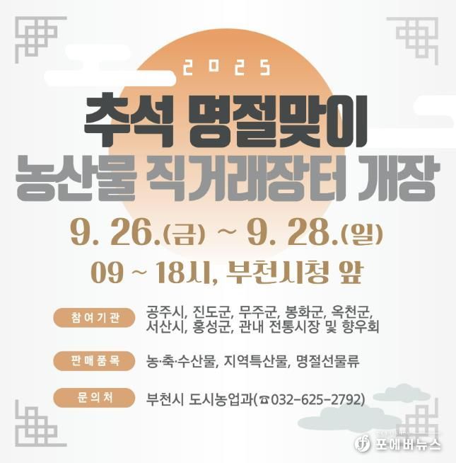 [ 포에버뉴스 김경순 기자 ] 부천시는 추석을 앞두고 9월 26일부터 28일까지 사흘간 시청 정문에서 ‘2025년 추석 명절맞이 농산물 직거래장터’를 운영한다.
