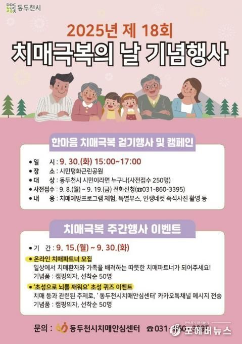 [ 포에버뉴스 김경순 기자 ] 동두천시치매안심센터는 제18회 치매극복의 날(9월 21일)을 맞아 9월 한 달간 다양한 행사를 운영한다. 이번 행사는 치매에 대한 부정적 인식을 개선하고 예방 활동을 널리 알리기 위해 마련됐다.