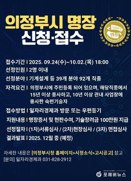 [ 포에버뉴스 김경순 기자 ] 의정부시는 우수 숙련기술인을 발굴하고 숙련기술 우대 문화를 확산하기 위해 ‘2025년도 의정부시 명장’을 공모해 선정한다.