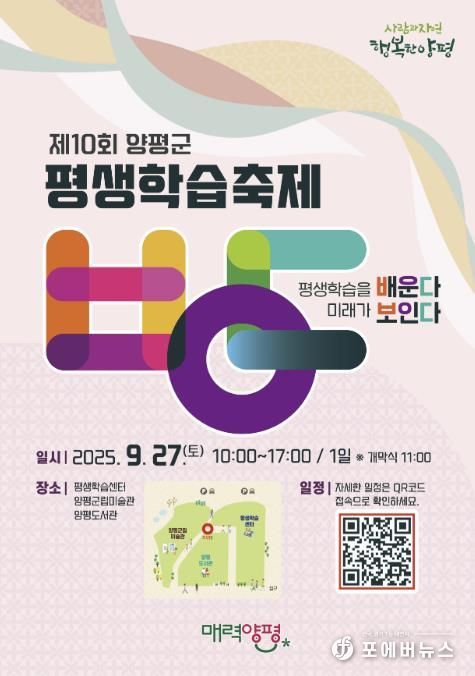 [ 포에버뉴스 박정배 기자 ] 양평군은 오는 27일, 양평군 평생학습센터 일원에서 ‘2025년 제10회 양평군 평생학습축제’를 개최한다고 밝혔다.