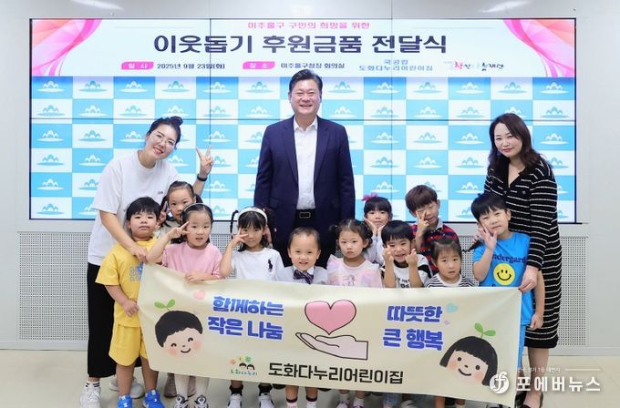 [ 포에버뉴스 김경순 기자 ] 인천 미추홀구는 23일 구청장실에서 국공립도화다누리어린이집(원장 이은정)으로부터 지역 내 저소득층을 위한 후원금 60만 원을 전달받았다.