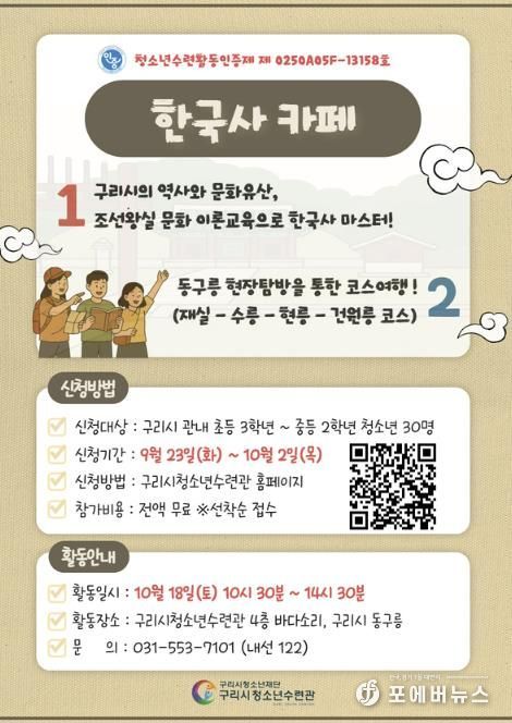 [ 포에버뉴스 김경순 기자 ] 구리시청소년재단 청소년수련관은 '2025 한국사 카페' 프로그램 참가자를 9월 23일부터 10월 2일까지 구리시 청소년수련관 홈페이지를 통해 모집한다.