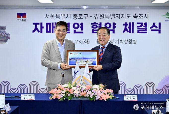 [ 포에버뉴스 사공선 기자 ] 강원특별자치도 속초시와 서울특별시 종로구는 9월 23일, 종로구청 기획상황실에서 상생발전과 활발한 교류 협력을 위한 친선결연 협약을 체결했다.