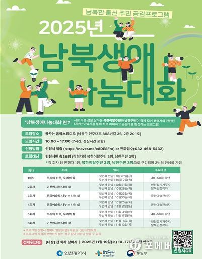 [ 포에버뉴스 김경순 기자 ] 인천광역시는 북한이탈주민과 인천 주민이 서로의 삶을 이야기하며 공감대를 형성하는 시민참여형 프로그램인 ‘남북생애나눔대화’ 를 9월 26일부터 11월 19일까지 진행한다고 밝혔다.