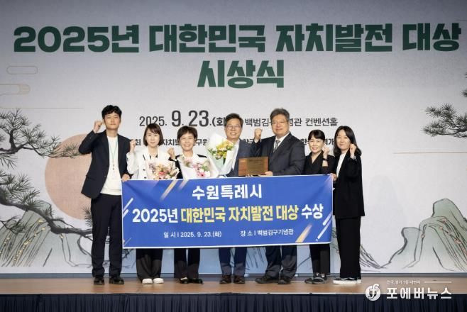 [ 포에버뉴스 김경순 기자 ] 수원특례시가 (사)한국자치발전연구원 주관 ‘2025년 대한민국 자치발전대상’에서 기초자치 부문 대상을 받았다. 시상식은 23일 백범김구기념관 컨벤션홀에서 열렸다.