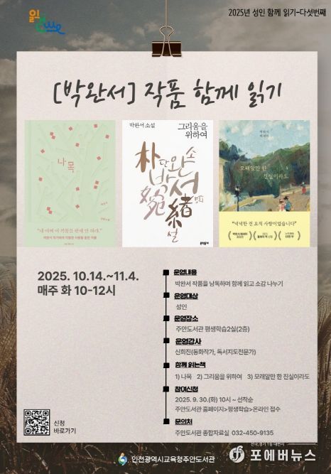 [ 포에버뉴스 김경순 기자 ] 인천광역시교육청주안도서관은 10월 14일부터 11월 4일까지 운영하는 ‘2025년 성인 함께 읽기-'박완서 작품 함께 읽기'’ 프로그램 참여자를 모집한다.