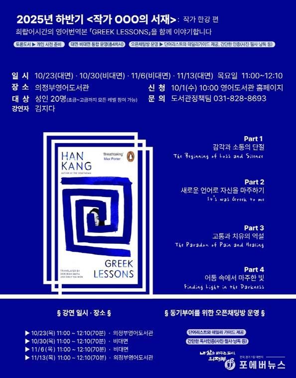 [ 포에버뉴스 김경순 기자 ] 의정부시 도서관은 2025년 하반기 ‘작가 OOO의 서재: 한강 편’을 10월 매주 목요일(23일, 30일, 11월 6일, 11월 13일) 총 4회에 걸쳐 의정부영어도서관에서 운영한다.