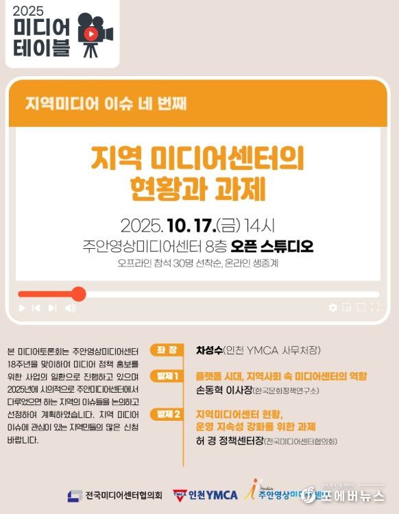 [ 포에버뉴스 김경순 기자 ] 인천 미추홀구 주안영상미디어센터는 오는 10월 17일 오후 2시 센터 오픈 스튜디오에서 ‘미디어 테이블: 지역 미디어센터의 현황과 과제’ 토론회를 개최한다.