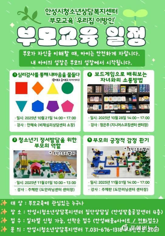 [ 포에버뉴스 김경순 기자 ] 안성시청소년상담복지센터는 오는 10월과 11월, 총 4회에 걸쳐 청소년 자녀를 둔 부모를 대상으로 ‘부모교육’을 진행한다고 밝혔다. 이번 교육은 자녀와의 원활한 소통과 부모의 심리적 소진 예방을 돕기 위해 마련됐다.