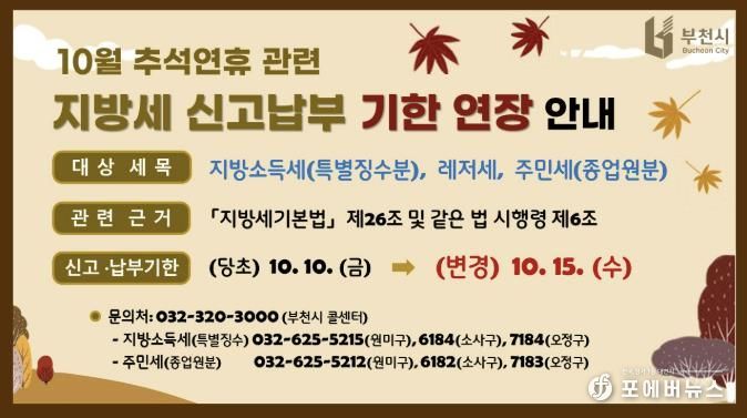 [ 포에버뉴스 김경순 기자 ] 부천시는 긴 추석 연휴로 인해 시민들이 지방세를 기한 내에 신고·납부하는 데 불편을 겪을 것으로 예상됨에 따라, 10월 납부 대상인 지방세 3종의 신고·납부 기한을 기존 10일에서 15일로 5일 연장한다고 밝혔다.