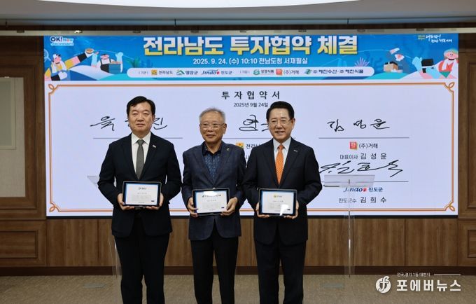 24일 전라남도청에서 전라남도와 영암군이, ㈜해진수산, ㈜해진식품과 투자협약을 체결하고 협력을 약속했다.