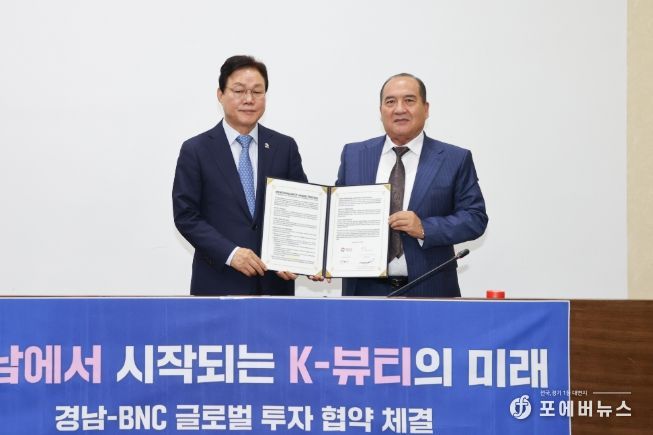 [ 포에버뉴스 사공선 기자 ] 경상남도는 24일 오전 9시(현지시간) 우즈베키스탄 타슈켄트에서 글로벌 에스테틱 메디컬 기업 ‘비엔씨 글로벌(BNC Global)’과 투자유치 업무협약을 체결했다.