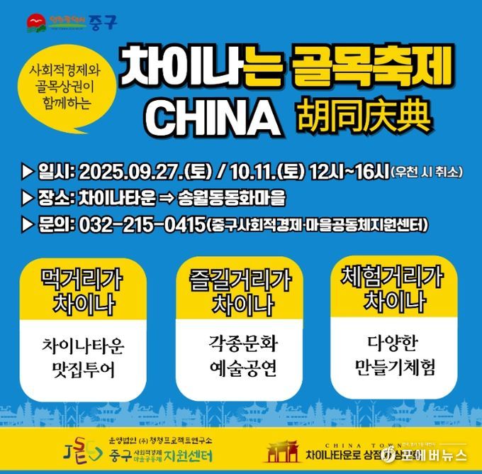 [ 포에버뉴스 김경순 기자 ] 인천 중구 사회적경제·마을공동체 지원센터는 올해 9월부터 11월까지 인천 차이나타운·동화마을 일원에서 ‘2025년도 사회적경제와 골목상권이 함께하는 '차이나는 골목축제'’를 개최한다고 25일 밝혔다.