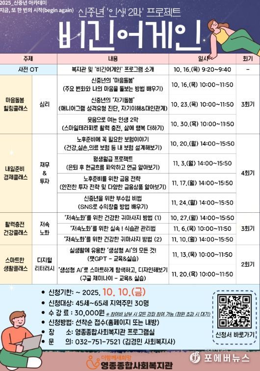 [ 포에버뉴스 김경순 기자 ] 인천 중구 영종종합사회복지관은 오는 10월 16일부터 11월 24일까지 45세~65세 지역 주민을 대상으로 신중년 아카데미 ‘비긴어게인’을 운영한다고 밝혔다.