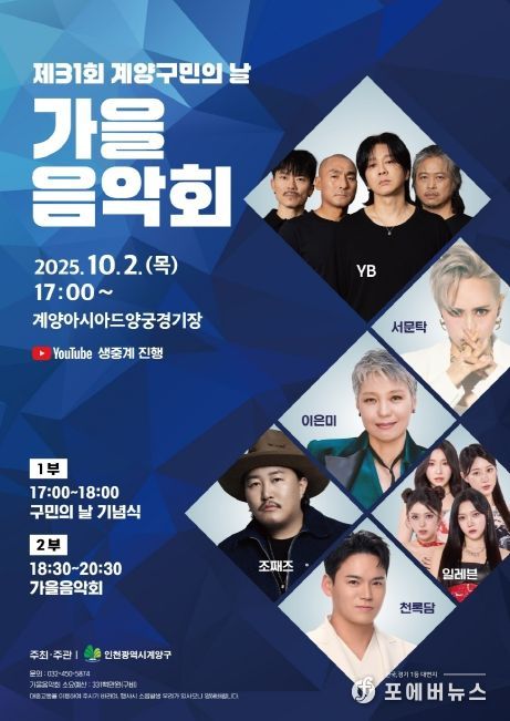 [ 포에버뉴스 김경순 기자 ] 인천광역시 계양구는 ‘제31회 계양구민의 날’을 맞아 오는 10월 2일(목) 오후 5시부터 계양아시아드양궁경기장에서 기념식과 가을음악회를 개최한다고 밝혔다.