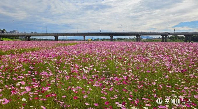 지난 7월 호우 피해를 이겨내고 다시 피어난 코스모스는 가을 하늘과 어우러져 장관을 이루고 있다.