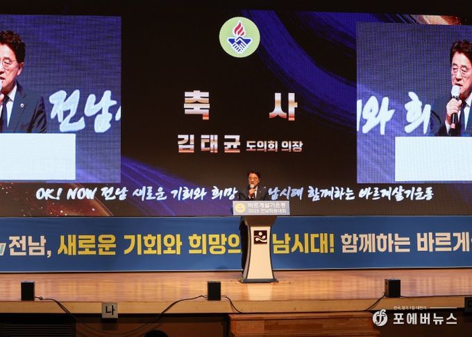 [ 포에버뉴스 오명숙 기자 ] 김태균 전남도의장은 9월 25일 전남도청 김대중강당에서 개최된 ‘2025 바르게살기운동 전남회원대회’에 참석하여 아름다운 전남만들기를 위해 노력해 온 유공회원에게 표창을 수여하고 축사와 함께 격려했다.