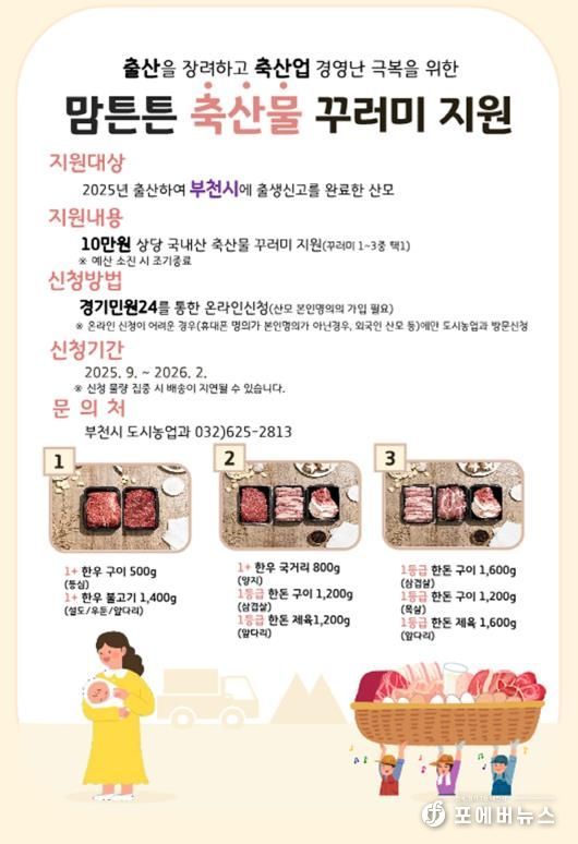 지원 대상은 2025년 1월 1일 이후 출산하고 부천시에 출생신고를 완료한 산모 2,384명으로, 1인당 10만 원 상당의 한우 또는 한돈 축산물 꾸러미를 제공한다.