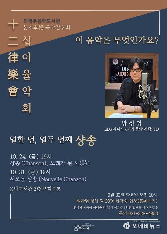 [ 포에버뉴스 김경순 기자 ] 의정부음악도서관은 음악 전문가의 해설과 함께하는 음악감상회 ‘십이율악회(十二律樂會)’를 10월에도 운영한다.