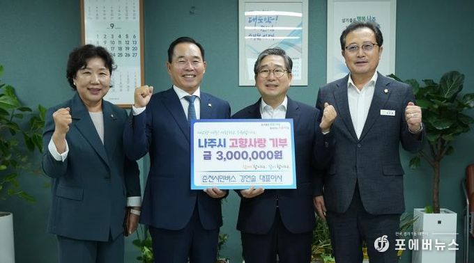 [ 포에버뉴스 오명숙 기자 ] 전라남도 나주시는 춘천시민버스 강연술 대표(왼쪽 두번째)가 지난 25일 지역사회 발전을 위해 고향사랑기부금 300만 원을 기탁했다고 밝혔다.