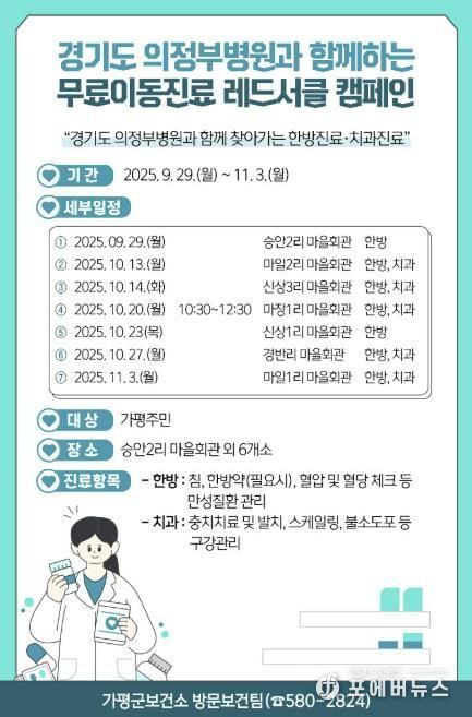 [ 포에버뉴스 김경순 기자 ] 가평군보건소는 수해지역 주민들의 건강 증진을 위해 경기도의정부병원과 함께 무료이동진료 사업인 레드서클 캠페인을 이달 29일부터 11월 3일까지 운영한다.