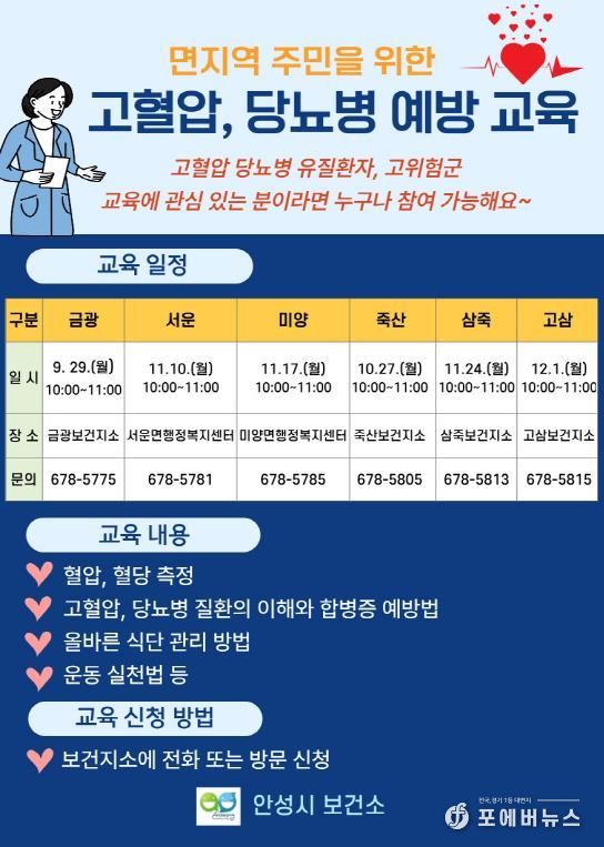 안성시보건소 관계자는 "고혈압과 당뇨병은 조기 발견과 꾸준한 관리가 무엇보다 중요한 질환"이라며 "이번 교육을 통해 지역 주민들이 올바른 건강관리 방법을 익히고 건강한 생활습관을 실천할 수 있기를 바란다"고 전했다.