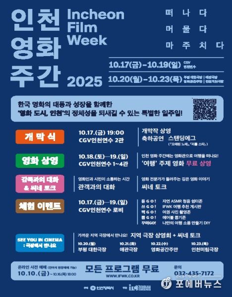 [ 포에버뉴스 김경순 기자 ] 인천광역시는 ‘영화 도시 인천’의 정체성을 새롭게 발견하고 시민 누구나 즐길 수 있는 복합 영화 축제 ‘인천 영화 주간 2025’을 10월 17일부터 10월 23일까지 인천 전역에서 개최한다고 밝혔다.