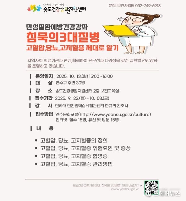 [ 포에버뉴스 김경순 기자 ] 연수구 송도건강생활지원센터는 오는 10월 13일 지역 주민을 대상으로 무료 건강 강좌 ‘침묵의 3대 질병: 고혈압, 당뇨, 고지혈증 제대로 알기’를 진행한다.